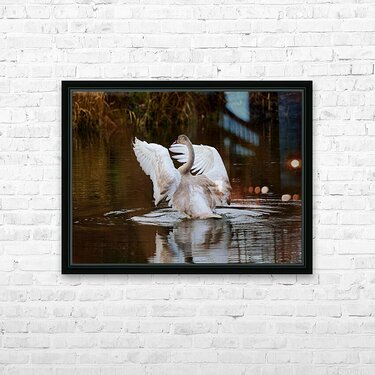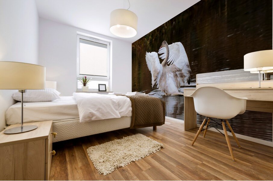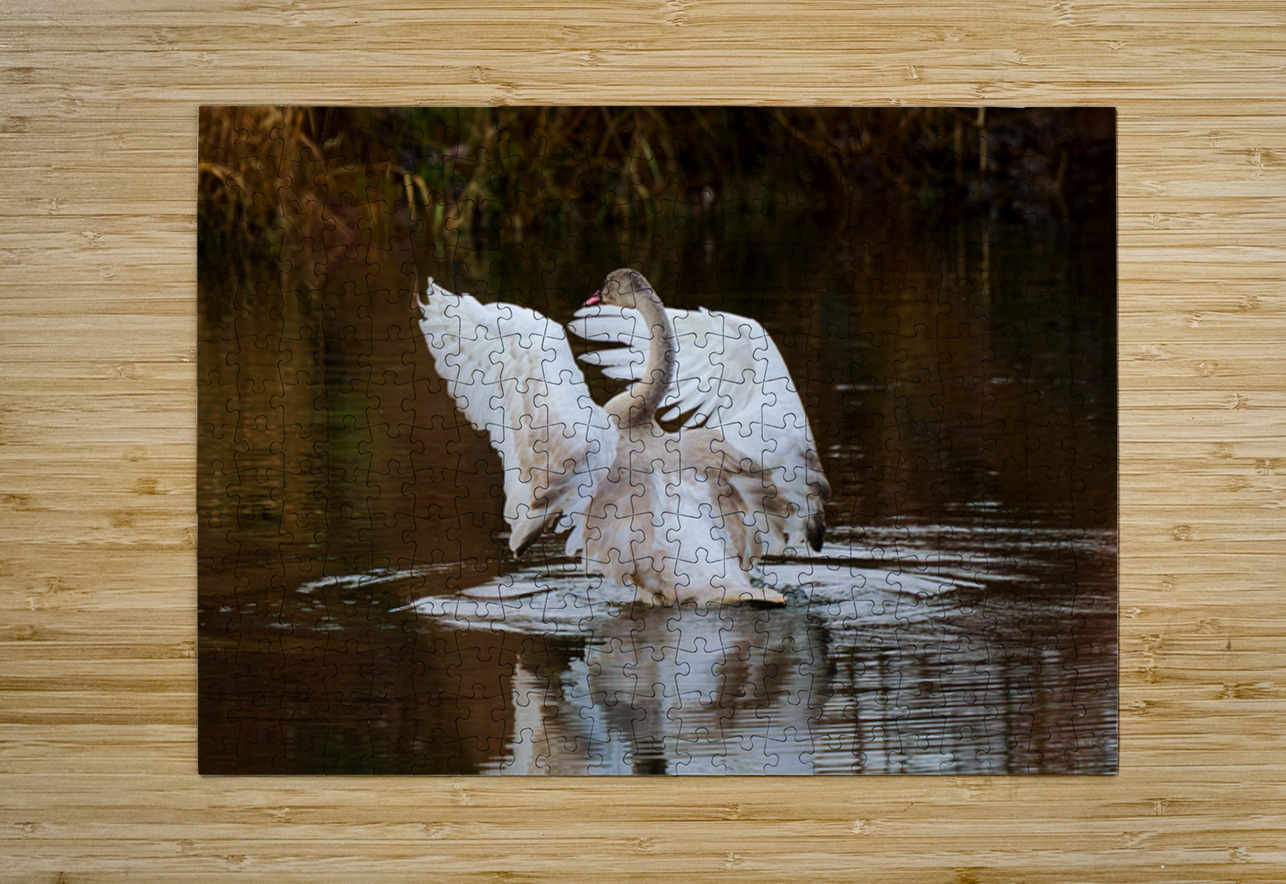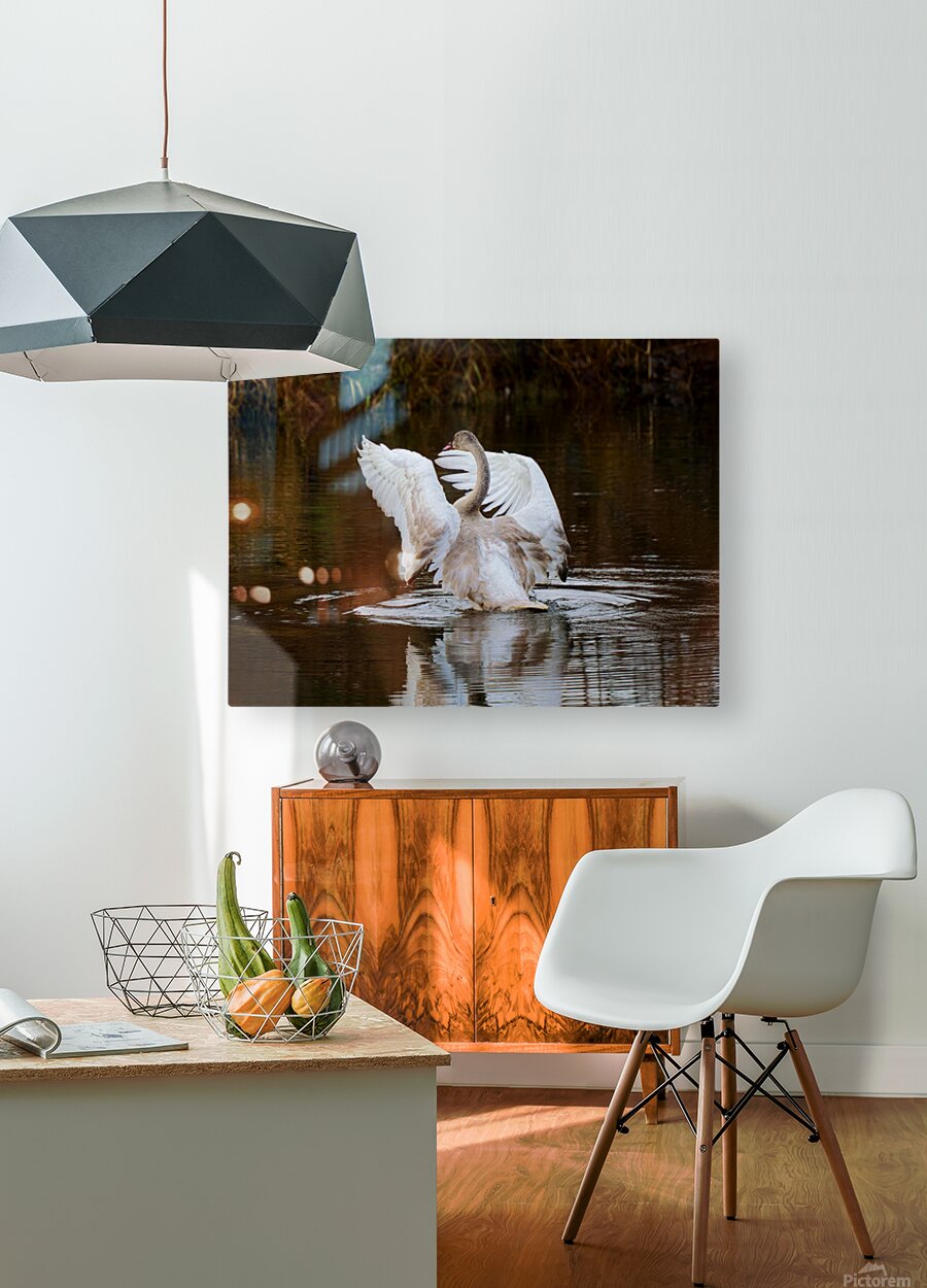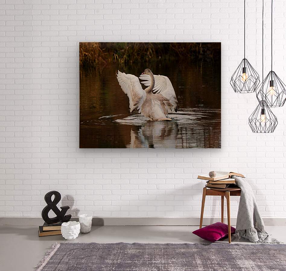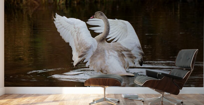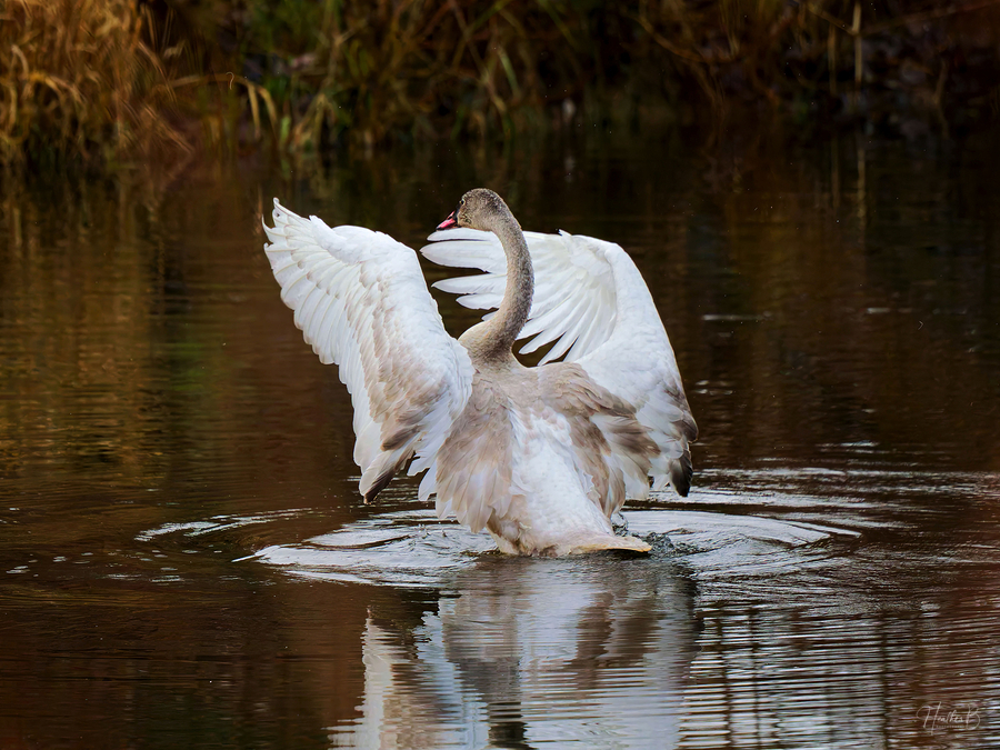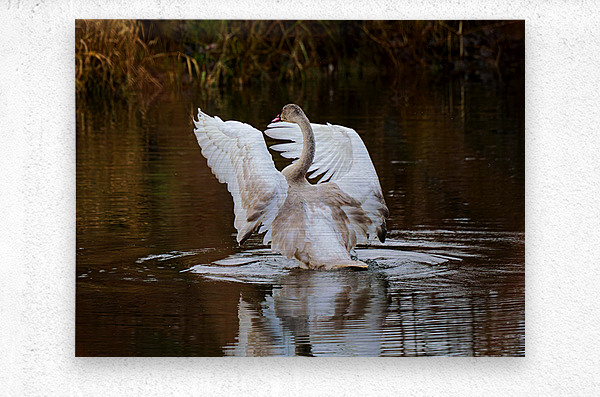 A young Trumpeter Swan spreads its wings, conducting the symphony Swan Song.