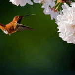 Rufous Hummingbird on target, ready to deploy tongue into the spring cherry blossoms. These amazing migratory birds travel from Mexico to Vancouver I...[+]